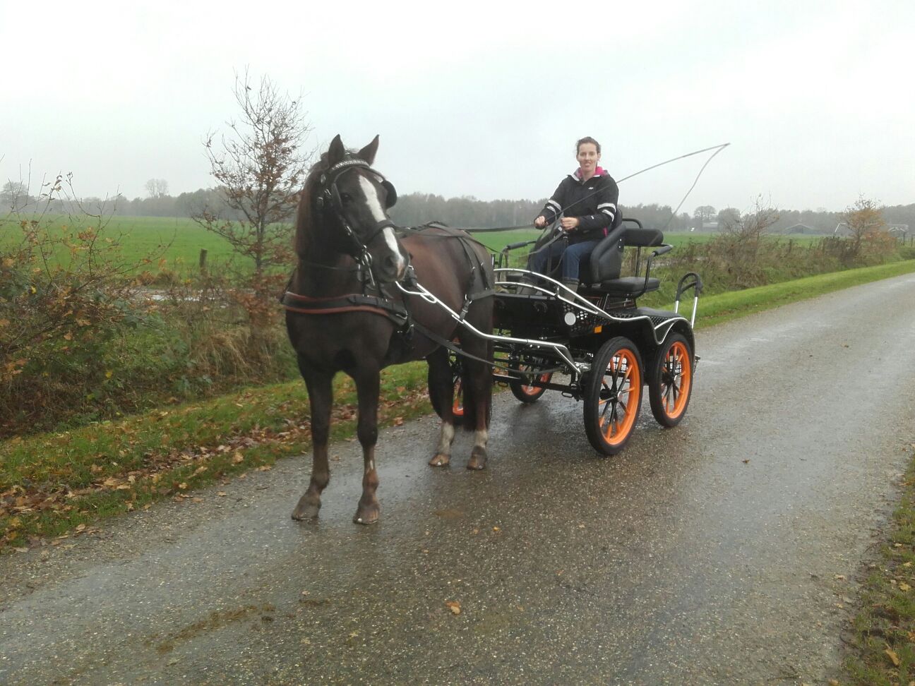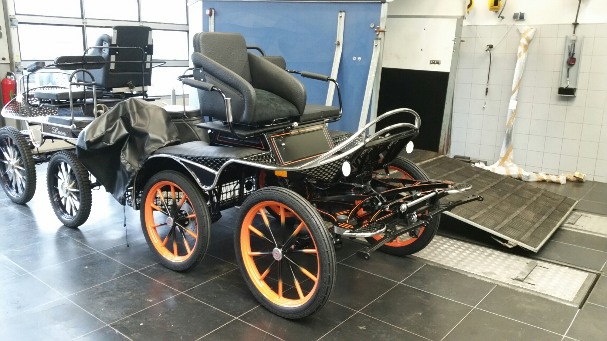 Hij is voor ons gemaakt door De Lemerij in Enter. Het zoeken van de juiste menwagen was nog een hele klus maar toen we uiteindelijk bij De Lemerij uitkwamen werden we daar bijzonder vriendelijk, goed en vlot geholpen. We kozen uiteindelijk voor het enkelspan model Karo met tweespan adapter. Zo kunnen we binnenkort ook Carmen naast Leonard voor de kar zetten (als ze eenmaal voor de wagen is beleerd).